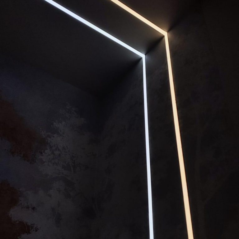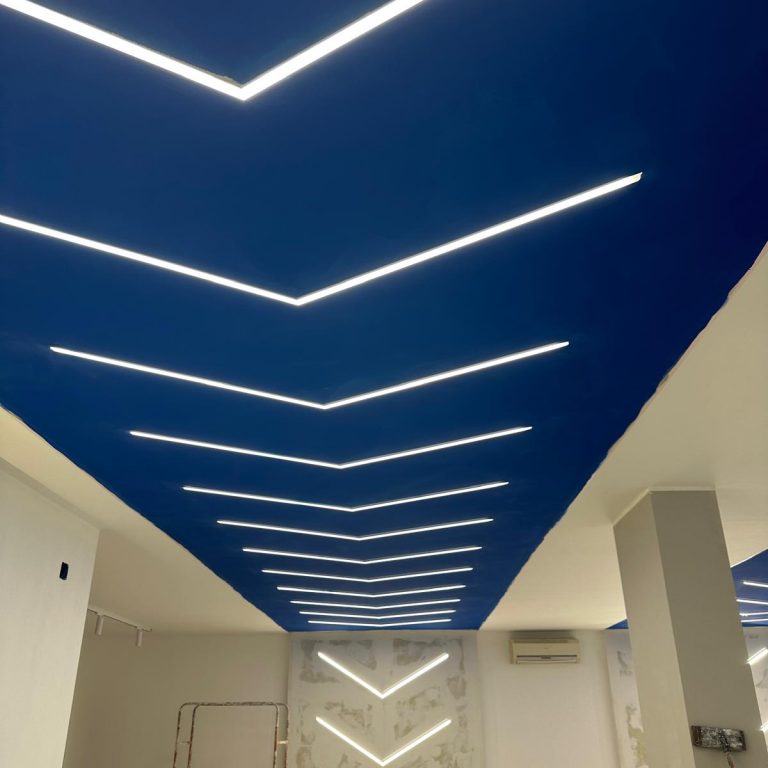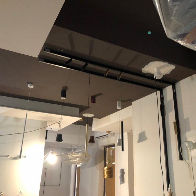 Realizzazione di un negozio di illuminazione, opere in cartongesso, pittura e stesura di carte da parati fino alla consegna dell’opera finita.